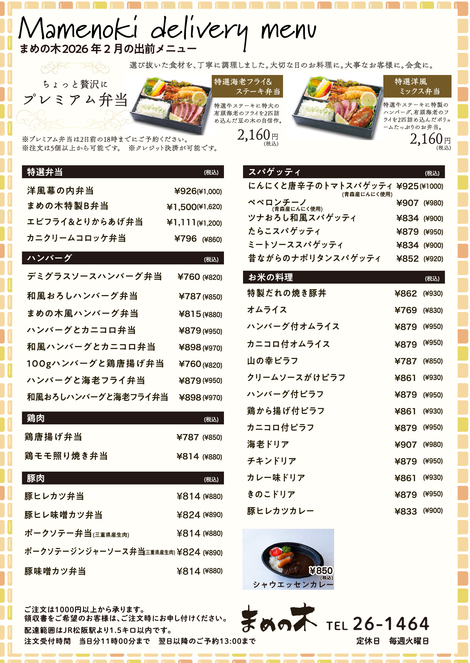 2025.9.25 | 2025年10月より日替わり弁当の料金を改定致します。日替わり弁当 価格改定のお知らせいつも当店のお弁当をご利用いただき、ありがとうございます! これまで私たちは、皆さまに「美味しくてお手頃なお弁当」をお届けするために努力を重ね、日替わり弁当を 650円 でご提供してまいりました。 しかし、近年続く原材料費や燃料費の高騰により、現行の価格を維持することが難しくなっております。 そのため、誠に心苦しいのですが、2025年10月1日より日替わり弁当を650円から700円へ改定させていただくことになりました。 これからも「美味しい!」「満足!」と感じていただけるよう、心を込めてお弁当作りを続けてまいります。 何卒ご理解賜りますようお願い申し上げます。 引き続き、まめの木のお弁当をどうぞよろしくお願いいたします🙇♂️ |