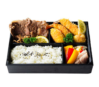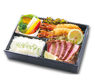 特選牛ステーキに特大の有頭海老のフライを 2匹詰め合わせた見た目にもうれしいお弁当。