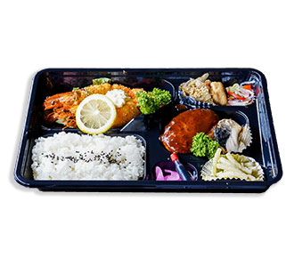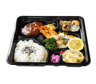 ハンバーグに海老フライなど定番のおかず にサラダや副菜をバランス良く入れた、み んな満足の幕の内弁当です。