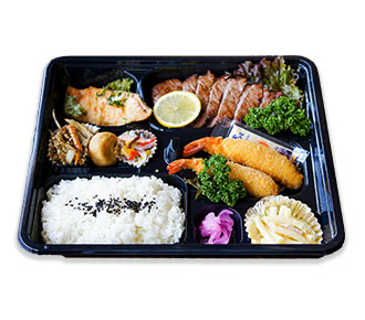 ボリューム満点のプレミアム弁当。 ステーキ200gにサーモンのムニエル、 海老フライをセット。