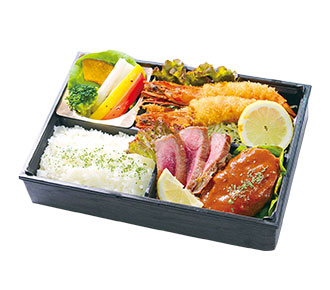 特選牛ステーキに特製のハンバーグ、有頭海老の フライを2匹詰め込んだボリュームたっぷりのお弁当。